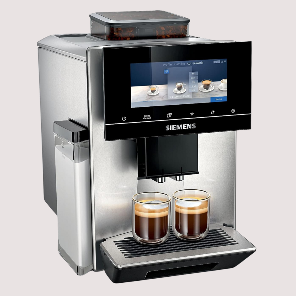 Der Siemens EQ900 TQ903D03 Kaffeevollautomat vereint modernste Technik und Barista-Komfort. Mit dem baristaMode lassen sich alle Brühparameter individuell einstellen, was Kaffeeliebhabern das Experimentieren mit Aromen ermöglicht. Das große 6,8-Zoll-Touchdisplay und die App-Steuerung bieten eine intuitive Bedienung, die auch von unterwegs gesteuert werden kann. Der Vollautomat arbeitet dank superSilent-Technologie angenehm leise und ist mit einem hochwertigen Mahlwerk ausgestattet, das die Bohnen für jede Zubereitung optimal mahlt. Die automatische Dampfreinigung sorgt für einfache Wartung und hygienischen Genuss. Der EQ900 ist ideal für anspruchsvolle Nutzer, die ihren Kaffeegenuss mit Hightech-Features und einem edlen Design verbinden möchten.