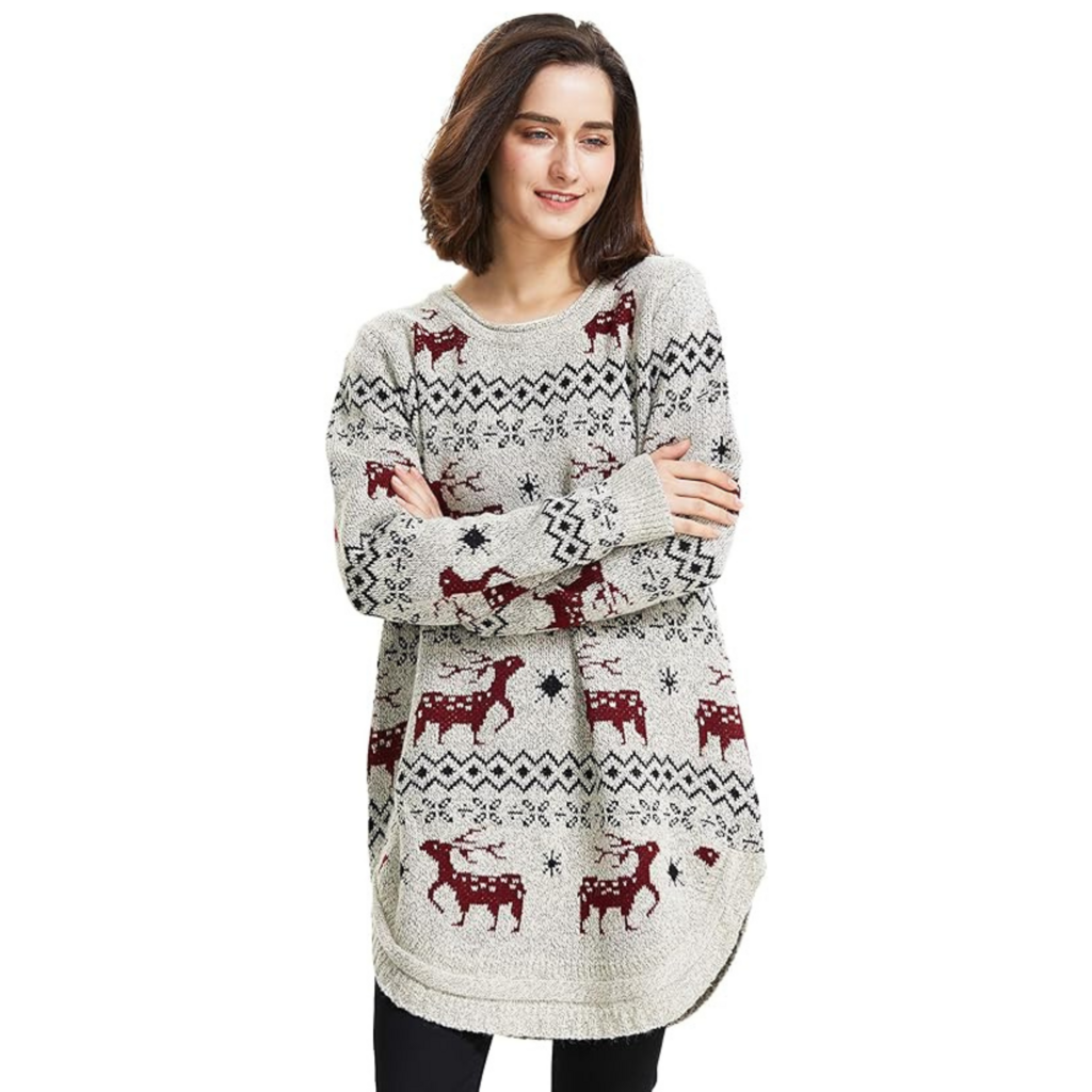 Mit diesem Damen Weihnachtspullover liegst du modisch ganz vorne. Der niedliche Rentier- und Schneeflockenprint verleiht dem Pullover eine süße und verspielte Note. Das weiche Material macht ihn besonders bequem und perfekt für den täglichen Gebrauch oder besondere Anlässe. Ob für die Weihnachtsfeier oder als Geschenkidee für deine beste Freundin – dieser Pullover passt zu jeder Gelegenheit und sorgt für einen festlichen Look.