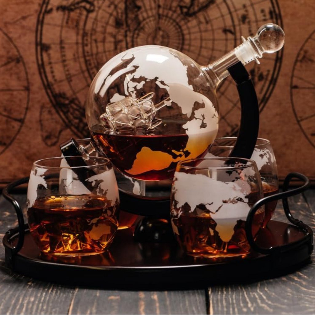 Das Whisky Karaffe Globus Set ist ein wahrer Hingucker. Der Globus-Dekanter mit eingravierter Weltkarte und zwei passenden Gläsern ist das ideale Geschenk für Männer, die Whisky oder andere Spirituosen lieben. Die handgefertigte Karaffe und der stilvolle Holzständer machen dieses Set zu einem edlen Accessoire für jede Bar. Ein perfektes Geschenk für den Vater, den Ehemann oder Freunde, die gerne stilvoll genießen.