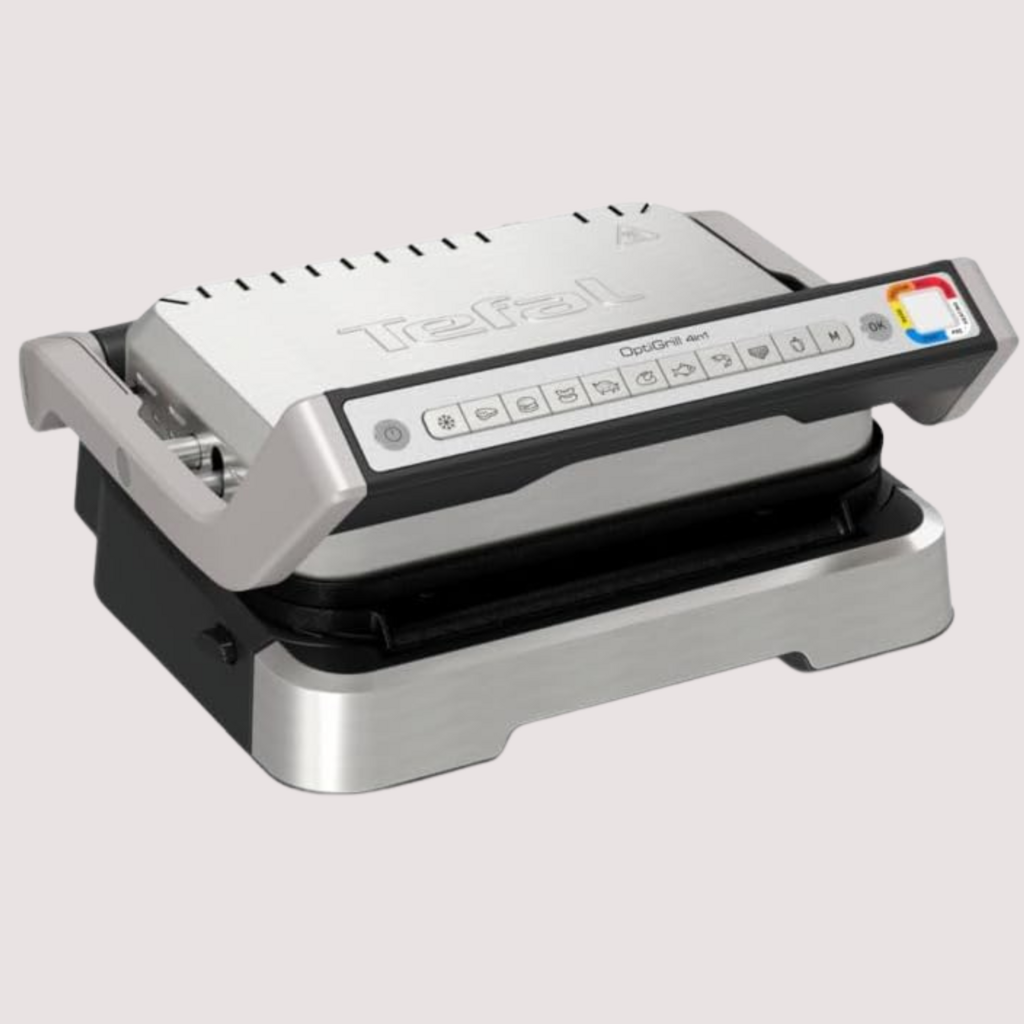 Der Tefal OptiGrill 4in1 überzeugt als vielseitiger Kontaktgrill, der sich für Grillen und Backen eignet. Mit 9 voreingestellten Programmen passt der OptiGrill die Grilltemperatur und den -zyklus automatisch an die Dicke des Grillguts an, um perfekte Ergebnisse von blutig bis durchgebraten zu garantieren. Eine Garstufenanzeige mit Farben und akustischen Signalen ermöglicht eine mühelose Kontrolle. Zusätzlich lässt sich der Grill aufklappen und in einen Tischgrill verwandeln, was flexible Zubereitungsmöglichkeiten bietet. Die mitgelieferte Backschale erweitert den Grill auch zum Mini-Ofen. Durch die herausnehmbaren, spülmaschinenfesten Teile wird die Reinigung besonders einfach. Ein Rezeptbuch und die Tefal App mit vielen Ideen runden das Paket ab. Damit ist der OptiGrill ideal für alle, die grillen und backen kombinieren möchten.