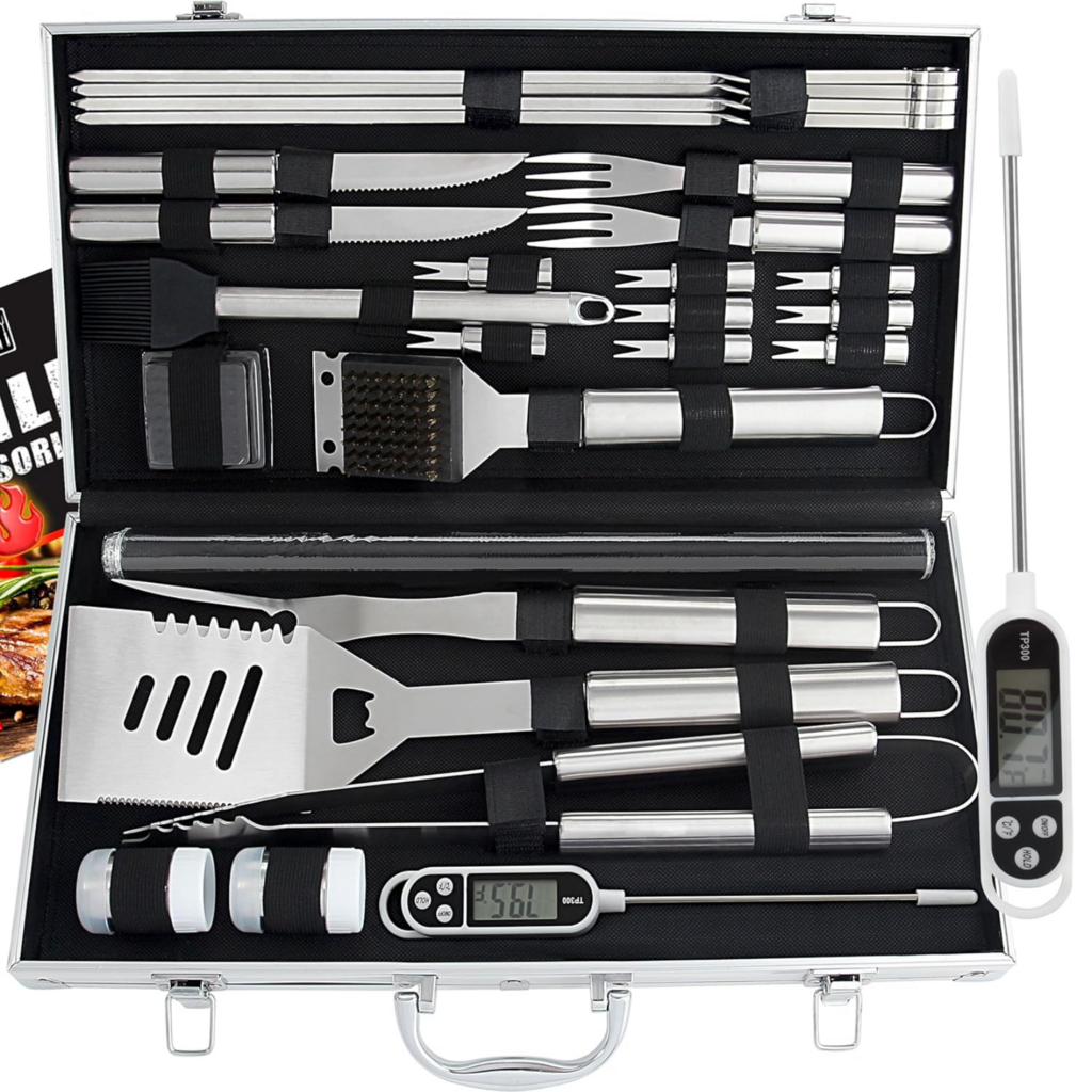 Dieses 28-teilige Grill-Set ist das ultimative Grillzubehör für Männer und alle Grillliebhaber. Es enthält hochwertiges Edelstahl-Grillbesteck in einem stilvollen Aluminiumkoffer, der alles sicher und organisiert aufbewahrt. Mit einem vielseitigen Set aus Spatel, Gabel, Grillzange, Grillmatte und vielem mehr bietet es alles, was für ein professionelles Grillerlebnis nötig ist. Jedes Teil ist rost- und hitzebeständig, sodass es langlebig und perfekt für den intensiven Einsatz am Grill ist. Ein ideales Geschenk für Papa, Ehemänner, Freunde oder alle, die gerne grillen – ob zu Weihnachten, Geburtstag oder Vatertag.
